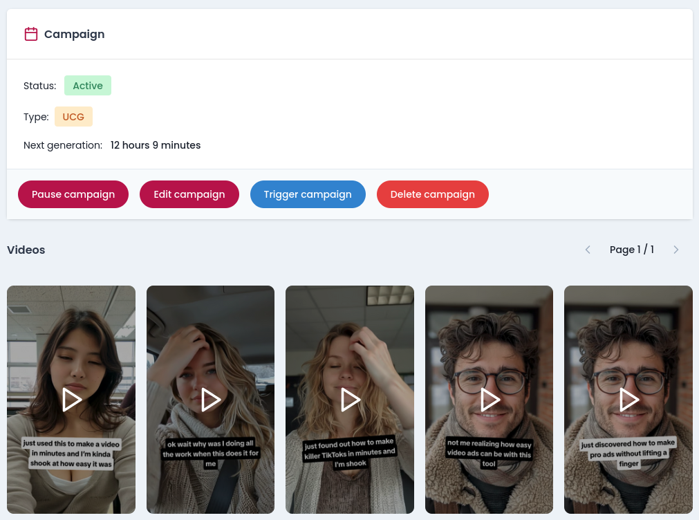 Each physical product in your inventory gets its own AI-powered video campaign. Upload product photos and descriptions, then watch as different AI influencers create unique ads showcasing your items from multiple angles.